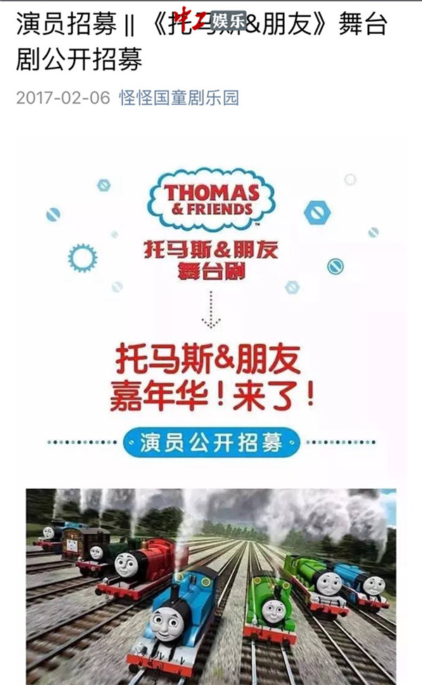 中工娱乐2017年3月7日报道 近年来国际儿童大IP陆续进华合作,除了传统的电影、动画片和衍生品之外,品牌呈现的形式越来越多样化,儿童舞台剧逐渐成为了新的选择。据悉,来自英国的国际儿童品牌《托马斯&朋友》中文版舞台剧也正在筹备中,计划为处于启蒙阶段的中国儿童舞台剧市场增添新的活力。