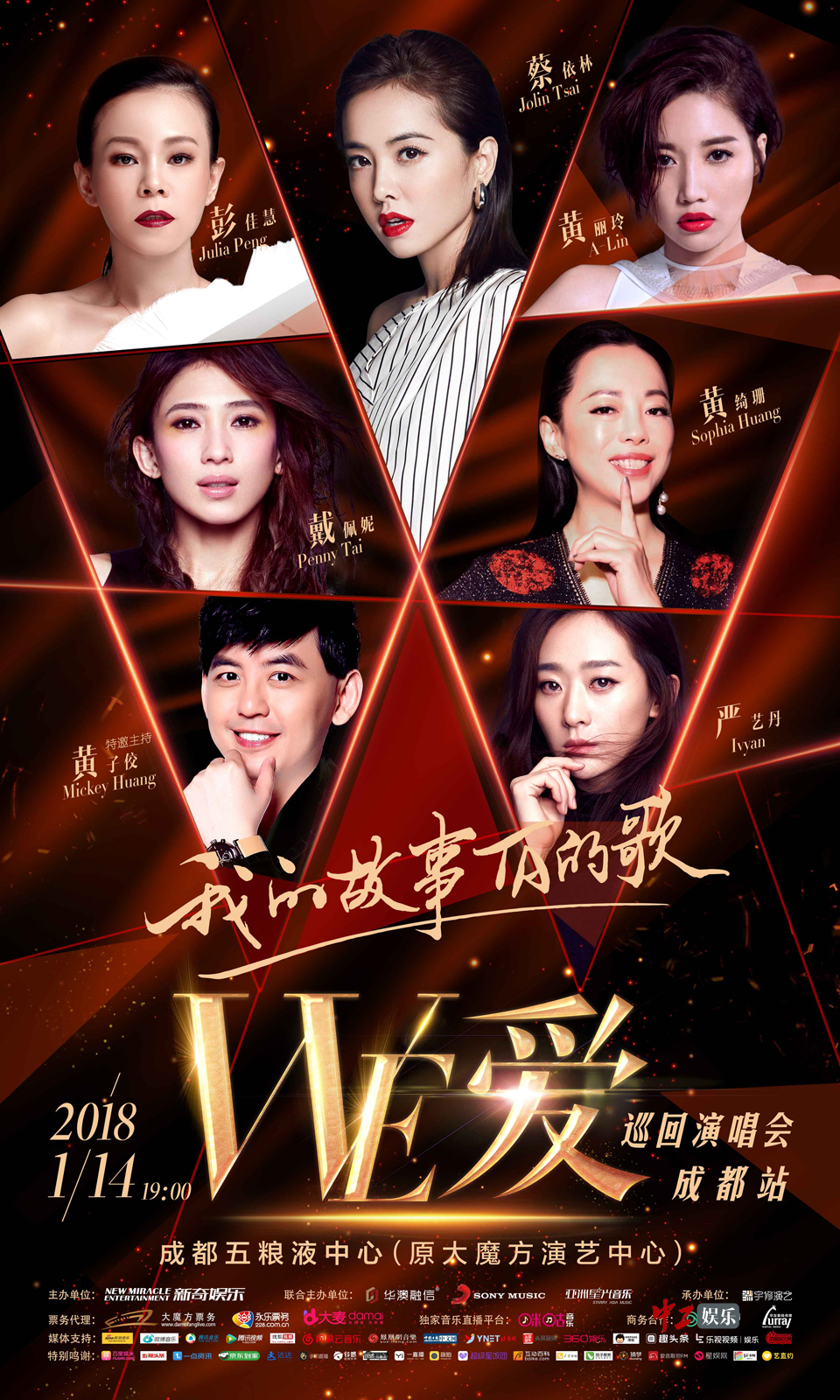 1月14日,”WE·爱巡回演唱会成都站——我的故事TA的歌”将以国内首创关注都市女性情感主题开启音乐之旅,我们追崇最纯净的美丽,最天真的梦想,无论你是哪一个故事,WE爱都希望用美打开你对世界的认知,因为有共同的追求,所以美好的人总会相遇,你准备好了吗?