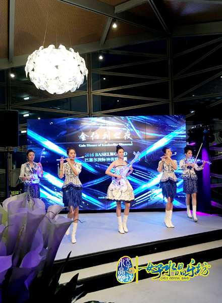 瑞士时间3月19日晚,金伯利钻石再度于巴塞尔世界钻石展厅举办“金伯利之夜”晚宴,晚宴特邀嘉宾中国著名男高音歌唱家郁钧剑、西方观众中最知名的华人当代艺术家萨顶顶、中国偶像器乐组合女子水晶乐坊等出席晚会。东方卫视知名主持人万蒂妮担任司仪。