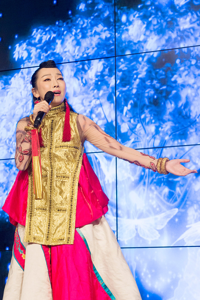 萨顶顶是是西方观众中最知名的华人当代音乐艺术家,是唯一夺得全球最权威BBC音乐奖的华人,也是入选格莱美音乐奖提名的唯一中国人。《神香》、《万物生》、《自由行走的花》三首成名作,萨顶顶空灵的声线和独特的民族表演风格将晚宴推向了高潮。