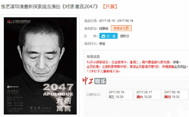 中工娱乐2017年5月22日报道 张艺谋执导的全新观念演出《对话·寓言2047》,于5月19日在国家大剧院官方售票平台公开售票,开票信息刚一放出就引发抢票热潮,开票两天好位置已被抢完。