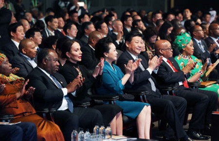 南非约翰内斯堡当地时间12月4日晚,山东姑娘表演的杂技《鼓韵》技惊南非“中国年”闭幕式文艺演出《中非时刻》。中国国家主席习近平夫妇和南非总统祖马夫妇及出席中非合作论坛约翰内斯堡峰会的各国领导人共同观看了这场文艺演出。