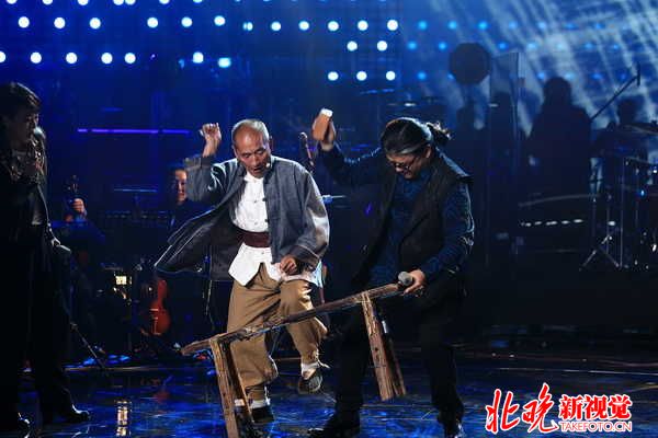 “女娲娘娘补了天,剩下块石头是华山。”在当晚的竞演中,谭维维一亮嗓就震撼了现场。在她身后的是五位老艺术家,他们手中是月琴、二胡,甚至还有独特的“打击乐器”长板凳,这正是来自陕西华阴的老腔艺术家们,他们用土生土长的腔调和乐器演奏起关中妇孺皆知的民谣“他大舅他二舅都是他舅”,老腔与谭维维的演唱穿插进行,居然融合地天衣无缝。当演出最后老艺人用枣木敲击起长板凳时,整个现场都沸腾起来了。