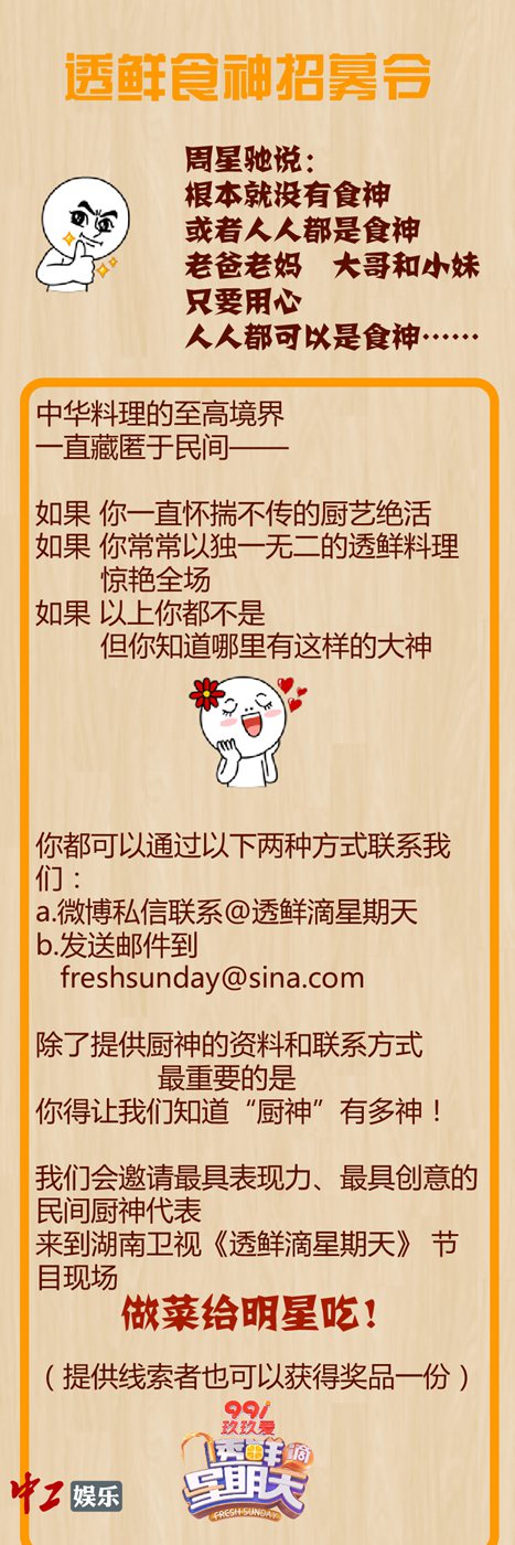 节目组将认真遴选,邀请其中最具表现力、最具个性的民间食神参与录制,与嘉宾亲密互动,做饭给明星吃。不妨让我们一同期待“透鲜厨神”在《透鲜滴星期天》中精彩的表现吧。