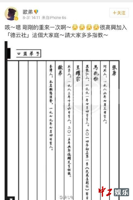中工娱乐9月2日报道 8月31日晚,台湾著名艺人欧弟发微博称:很高兴加入“德云社”这个大家庭,请大家多多指教,并附上有自己名字和介绍的《德云社》家谱图。家谱显示:欧弟,台湾人。本名欧汉声,一九七九年七月四日生人。