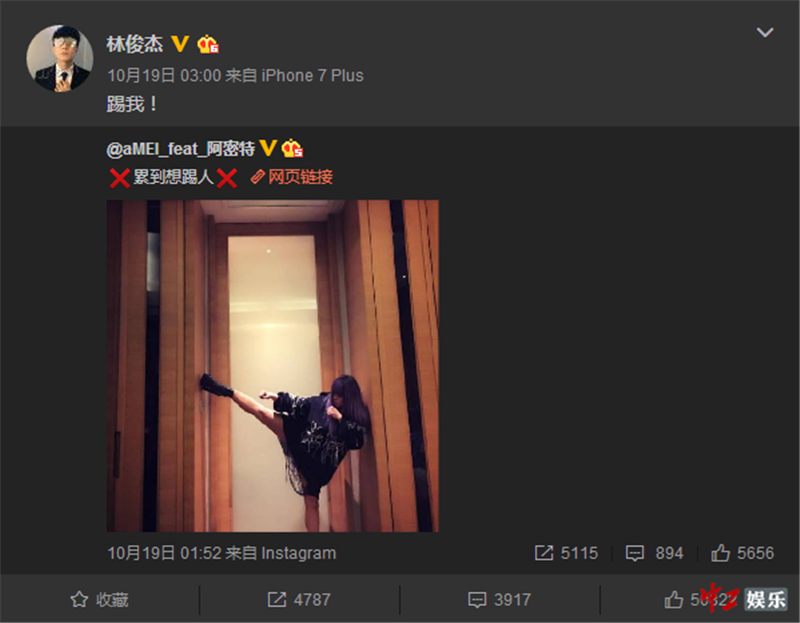 说起张惠妹与林俊杰,二人也算是娱乐圈的一对模范“姐弟联盟”。早在2001年,林俊杰就为阿妹写下名曲《记得》,阿妹也总为JJ站台,还在其妈妈生病时给予安慰。二人互动频繁,在彼此微博里名字出镜率都极高。10月19日,张惠妹深夜在发微:“累到想踢人”。配图中阿妹眼神带“杀气”,双手握拳,一个暗藏爆发力的下颚踢动作。由此可以看出《声音的战争》录制强度,以及来势汹汹的素人歌手能耐有多大?连张天后都怒了,评论中还有不少网友心疼阿妹太辛苦,腿都瘦了一大圈。这次,张惠妹是豁出去了!