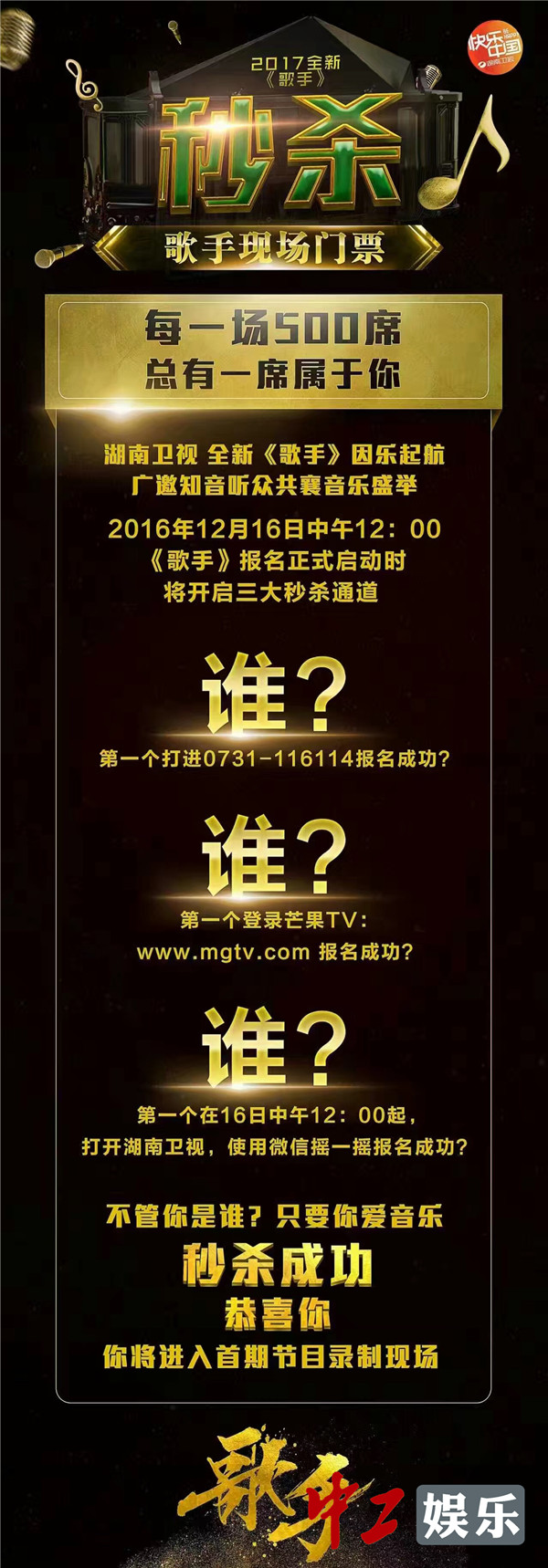 3. 12月16日中午12:00起任何时段打开湖南卫视,使用微信摇一摇报名;