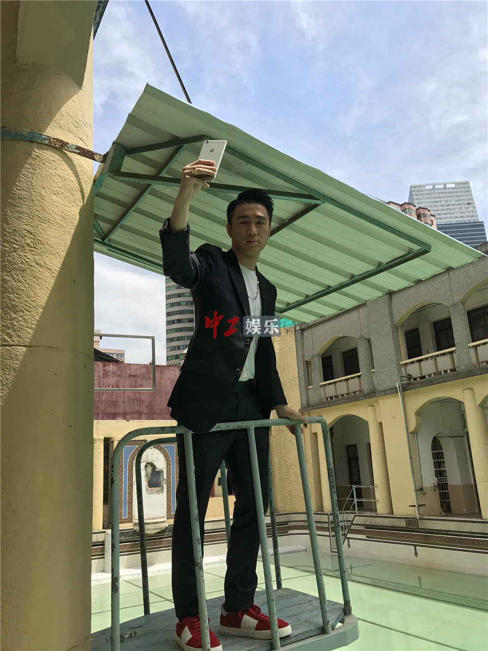 拍摄过程中,何猷君一改平日的学霸形象,身着白色字母简约T恤,蓝色休闲裤凸显修长身材,搭配白色绑带休闲鞋与黑框眼镜,身处充满历史感的建筑中,背靠露天泳池,属于95后的青春气息简直要溢出屏幕。