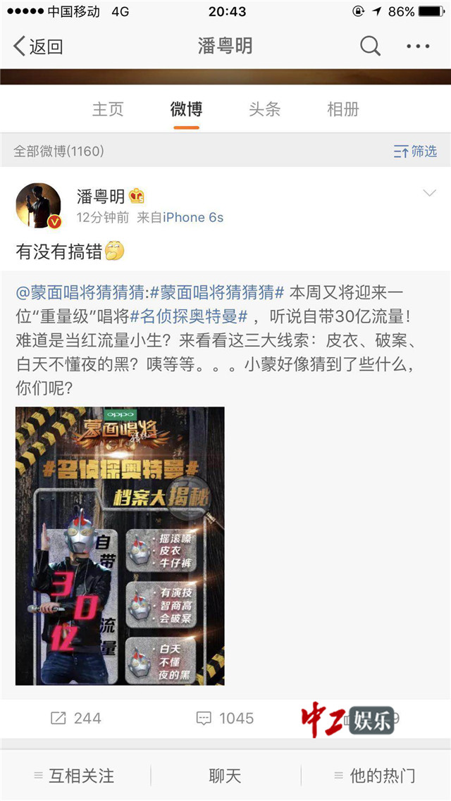 微博出来后,潘粤明耿直地直接转发帮打call,调侃“有没有搞错!”该配合演出的粉丝们也揣着明白装糊涂,纷纷装傻表示“猜不出来。”摇滚老炮儿这次再过摇滚瘾,献唱摇滚版《白天不懂夜的黑》,曾经给潘粤明当过评委的巫启贤熟谙潘式唱腔,这次他坐在《蒙面唱将》的猜评席上,顺便调侃了一把,称潘粤明的嗓音很适合唱摇滚,但“唱别的歌也不怎么样。”潘粤明究竟怎样把情歌唱成摇滚范儿,网友早已期待不已,周日(11月12日)晚20:30锁定江苏卫视看《蒙面唱将猜猜猜》。