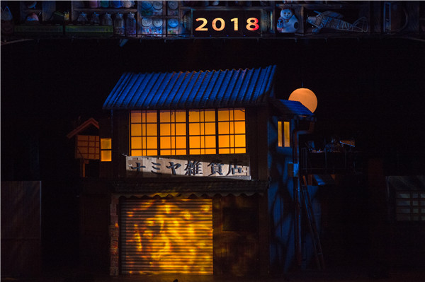 为了还原书中的场景,剧组主创人员深入日本小镇探访老店,大量研读相关专业书籍和日本当时的影视作品,就是为了在舞台上打造一个真实的“浪矢杂货店”。但仅仅做到建筑外观上的“真实还原”是远远不够的,由于舞台空间的局限性,要在有限的空间承载剧中多幕场景的变换,对舞美、灯光设计的要求极高。舞台上的每一块景片都暗藏玄机,比如三个小偷脚下榻榻米就设置了6个机关,快速进行场景变化。