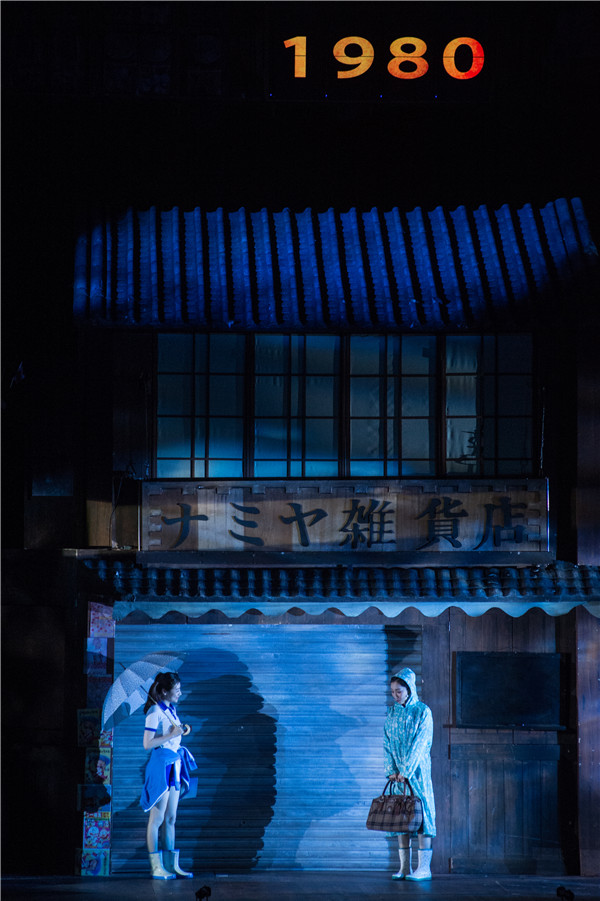 《解忧杂货店》最有特色的是它是一个时空交错故事,是现代人帮助过去人来解忧的一个故事。时空的交错感在电影中会比较容易表现,电影可以使用蒙太奇或者特效,但是舞台剧在表现时空流转上也有它独到的表现方式。