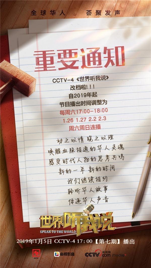从2019年1月5日起,由中央广播电视总台中文国际频道(CCTV-4)推出的《世界听我说》第三季将根据新的编播安排调整为每周六17:00-18:00与大家见面!
