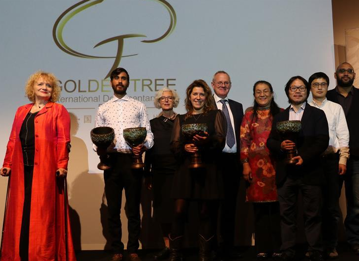 10月13日,在德国法兰克福,评委会成员和获奖影片代表出席第四届金树国际纪录片节闭幕式。 第四届金树国际纪录片节(金树节)13日晚在德国法兰克福举行颁奖典礼暨闭幕式。中国纪录片《黄河尕谣》获组委会特别奖。