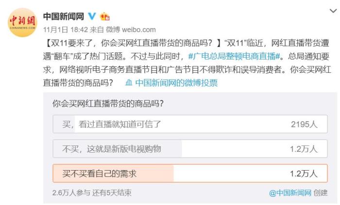 在一则“你会买网红直播带货的商品吗?”的微博投票中,有接近半数的网友表示“不买,这就是新版电视购物”,也有网友表示“买不买看自己的需求”,仅有不到10%的网友说“买,看过直播就知道可信了”。
