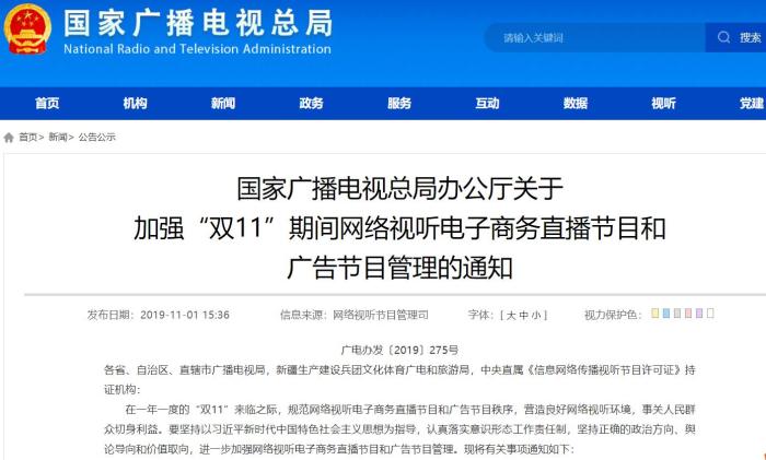 11月1日,国家广播电视总局发布《总局关于加强“双11”期间网络视听电子商务直播节目和广告节目管理的通知》,要求加强“双11”期间网络视听电子商务直播节目和广告节目管理。
