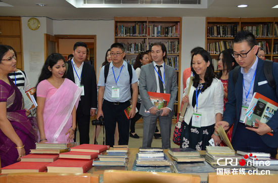 在多名印度艺术家的陪同讲解下,代表团成员参观了印度传统乐器、现代绘画等展厅以及学院图书馆。古老神秘的印度传统艺术与多元化的现代艺术作品,给代表团成员留下了深刻的印象。