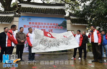 11月25日上午,第四届国际长征体育运动会暨2015中国大学生户外越野挑战赛在广西兴安县开幕,中央美术学院王其钧教授为运动会组委会赠画。