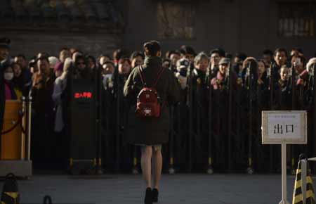 昨天上午7时30分,关晓彤在母亲的陪同下来到了北电,一身蓝色外套配上黑色打底裤的她笑着告诉记者,这次心情没有初试那么紧张。7时40分,关晓彤开始排队等候进场。