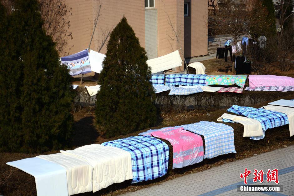 2月24日,济南,在山东长清一高校内寒假结束返校的大学生们在宿舍楼前晾衣绳上,球场上,草坪上,阳台上晾满了花花绿绿的的被褥,远望去铺天盖地,场面十分壮观。王预 摄 图片来源:视觉中国