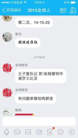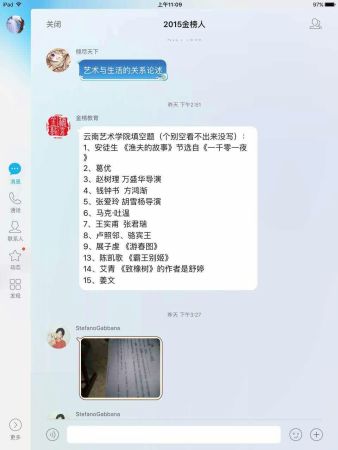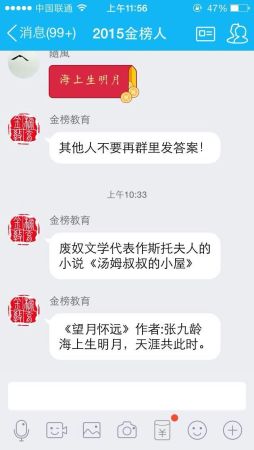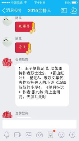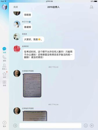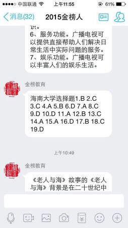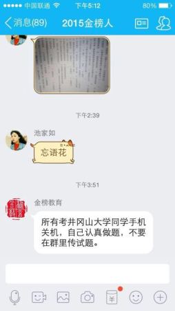 这组截图显示,有人往一个名叫“2015金榜人”的QQ群内传了试题照片后,一名名叫“金榜教育”的网友先是在群里发布答案,“金榜教育”还在群里要求“在考试时间,这个群里不允许任何人聊天,只能用于办公通知!还有群里没有修改名字备注的同意删除!请及时修改!”之后,“金榜教育”又发出号令“所有考金刚山大学同学手机关机,自己认真做题,不要在群里传试题。”之后,“金榜教育”还在群里公布了海南大学的选择题答案,“其他人不要再往群里发答案!”