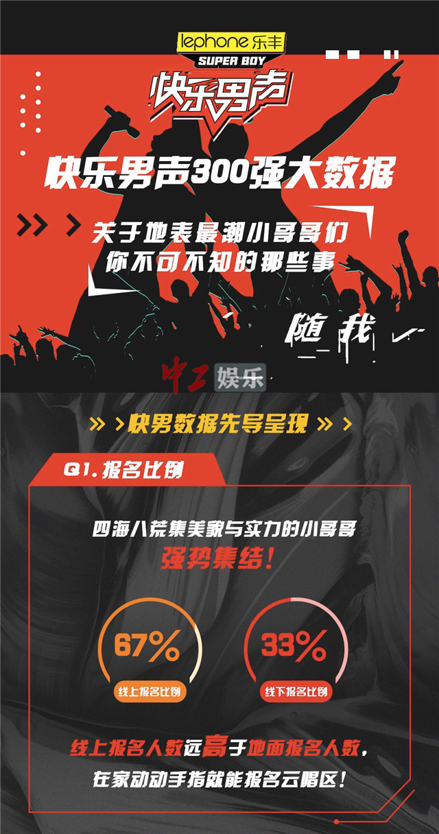 中工娱乐2017年5月11日报道 在今年快乐男声的报名选手中,95后小鲜肉占比35%,92年的都算“中年选手”。林俊杰、周杰伦成选手选歌首选,五分之一的选手选歌青睐林俊杰。近日2017快乐男声全国300强选手出炉,官方发布的大数据图里暗藏玄机。对此,有网友吐槽,这哪里是节目数据图,简直是90后生活启示录啊!