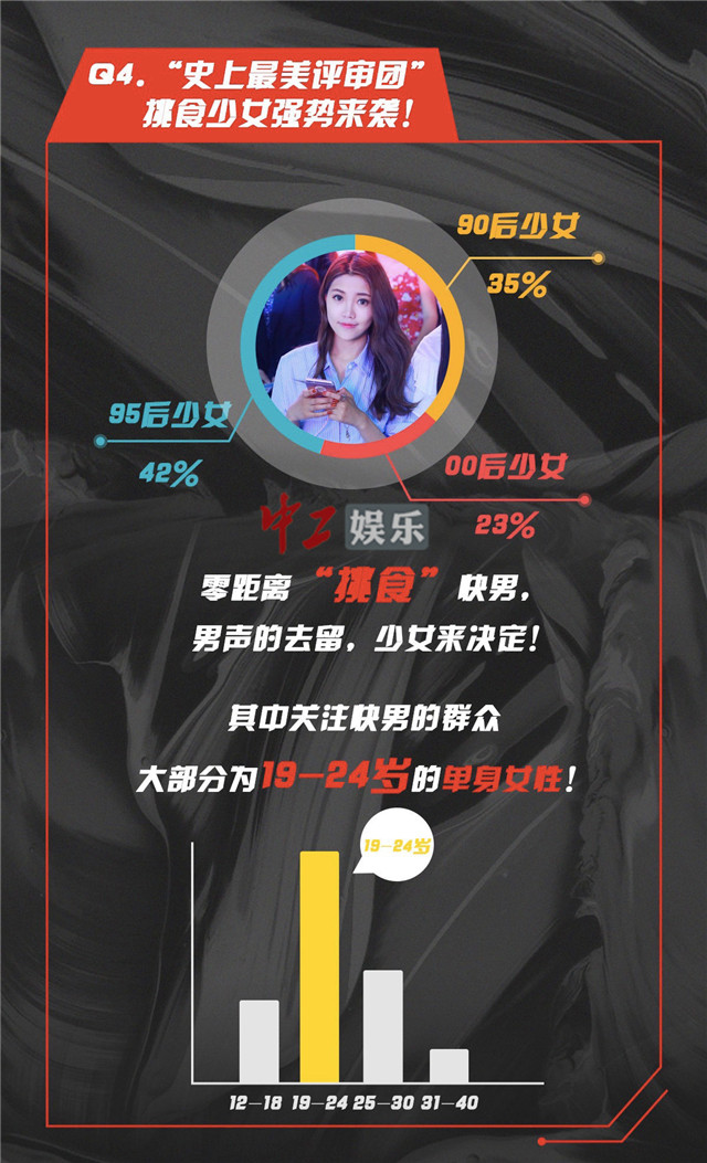 除了关注选手外,观众群体也是大数据图的一大亮点。有趣的是,关注快男的人群中集中分布在19-24岁这个年龄阶段,并且大部分都是单身女性。有网友吐槽,这不是节目数据图,而是90后生活启示录。