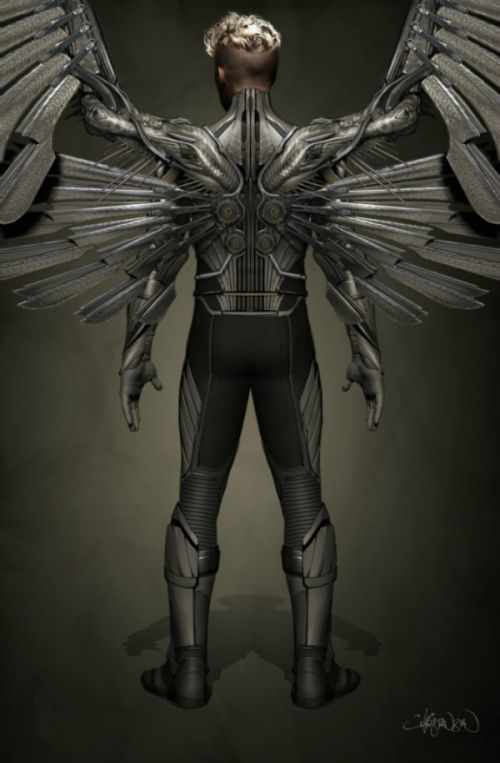之前曝光的“大天使”概念图在原著漫画中,大天使本是普通变种人,全名叫Warren Kenneth Worthington III,原拥有一双如飞鸟般的白色翅膀。但这个他引以为傲的翅膀后被惊恶先生雇佣的“掠夺者”小队破坏并坏死,Warren的室友不得已将其锯断,以保持Warren的生命。就在此时,Warren遇到了“天启”,获得了无坚不摧的金属翅膀,成为“大天使”,但代价是受到“天启”精神控制,成为天启四骑士的领军人物“死亡”。