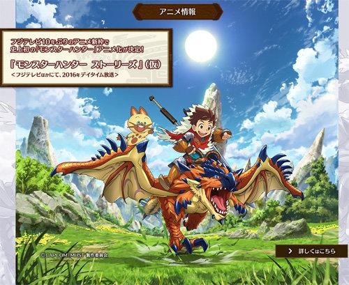 《怪物猎人物语》3DS游戏于2016年发售,讲述骑着怪物进行战斗的“骑手”与怪物之间的羁绊。长达48集的TV版动画《怪物猎人物语》也将在2016年播出,不论是游戏还是动画,从画面上看都比较偏向儿童向,负责制作动画的富士电视台宣称要制作成类似《樱桃小丸子》等国民级动画的水平,可谓野心不小。不过,从现在网友们的反应来看,大家似乎都不看好此番,究竟如何还要等正式播映才能评价了。