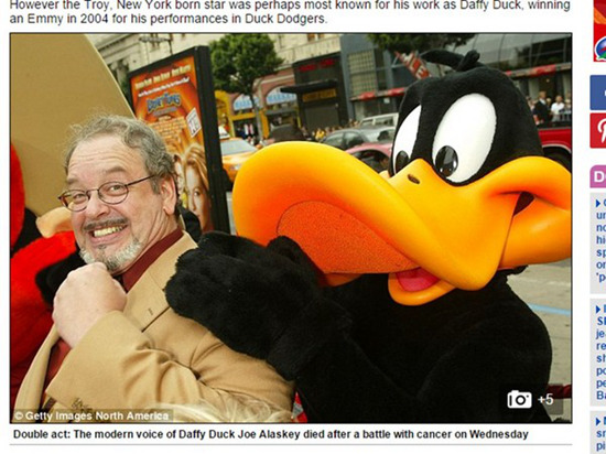 中新网2月5日电 据台湾“东森新闻”报道,美国知名动画角色“达菲鸭”的配音员乔·阿拉斯加(Joe Alaskay)因癌症病逝病逝,享年63岁。乔生前为华纳经典动画《乐一通》(Looney Tunes)配音,而且1人分饰多角,包括大家熟悉的兔八哥、达菲鸭、崔弟等。