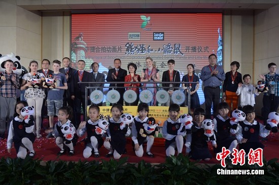 中新网北京3月28日电(记者 张曦)28日,中捷合拍动画片《熊猫和小鼹鼠》在北京举办首播发布会,少儿节目主持人月亮姐姐还演唱了片尾曲《真诚的守候》,引发关注。