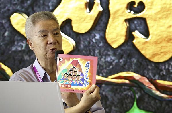 老导演周克勤展示自己珍藏的旧版《葫芦兄弟》画册。澎湃新闻记者 高剑平 实习生 俞思亭 图