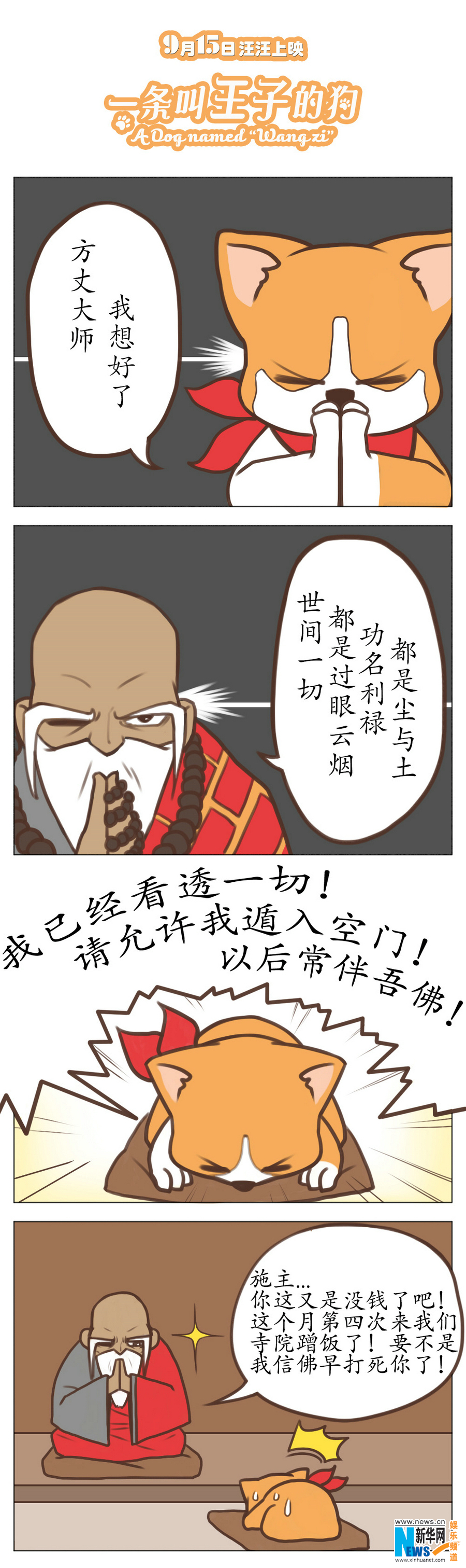 柯基作为狗届至蠢至萌的典型代表,平日的日常里肯定少不了好玩的事情,无论是和女朋友出行,还是跑到方丈面前喊着要“皈依佛门”,呆萌的“王子”都能带来笑料百出的故事。这组四格,角色间的互动和对话可谓是包袱不断,可爱的形象更是萌化人心。漫画过后,这只叫“王子”的柯基犬主演的大电影也将于9月15日中秋节上映,想必届时这条狗狗在大银幕上定会呆萌力MAX,在大世界的历险中收获属于自己的成长!