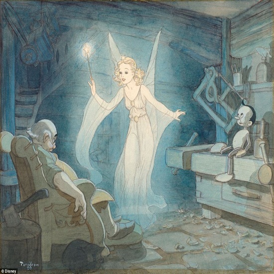 蓝色仙女对匹诺曹施魔法(1940年)瑞典著名插画家Gustaf Tenggren水粉版