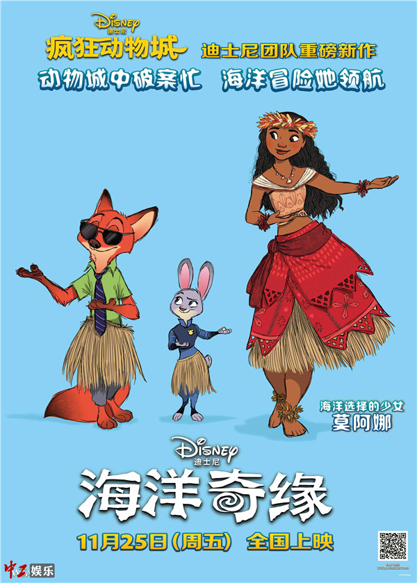 中工娱乐11月16日报道 由中影/华夏发行、迪士尼动画工作室制作、迪士尼影业出品,《疯狂动物城》、《超能陆战队》、《冰雪奇缘》原班人马打造的动画冒险喜剧《海洋奇缘》(Moana)将于11月25日中美同步公映。今日影片发布一款中国独家海报,《疯狂动物城》主角兔朱迪和狐尼克与这次的主角莫阿娜身着草裙共舞,倾情助阵《海洋奇缘》。此外,这部迪士尼团队重磅新作的北美首批媒体影评也已出炉:烂番茄新鲜度高达100%,成绩耀眼,已被业内看好是奥斯卡最佳动画长片的有力竞争者!