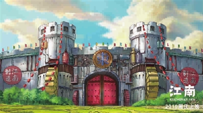 作为一部动画电影,《江南》也主打国风审美路线,在策划之初,主创团队就在寻求美术风格上的突破,尤其是“军工机械”一出,从字面上就透着冷硬感。为中和冷硬的军工风,主创者用浓郁的东方审美情趣来做调和——师徒情是故事线索里的东方哲学;上海豫园灯会、九曲桥上点点星光、龙腾虎跃是历史人文里的东方景致;而用模拟洗涤过的艳丽涂料,渲染出旧而不破、带有幻想色感的画风,则是视觉上的东方呈现。海报中,一对少男少女肩并肩站立在一艘铁甲战舰的桅杆上远眺,灯火璀璨的空中飘动绚丽的灯饰,映出钢筋铁骨的轮廓,虽已是夜晚但仍喧嚣辉煌,充满沉着绚丽的气氛,透亮的天空、铅笔质感的色线等等,都是别具一格的国风指征,传播着民族艺术的经典。