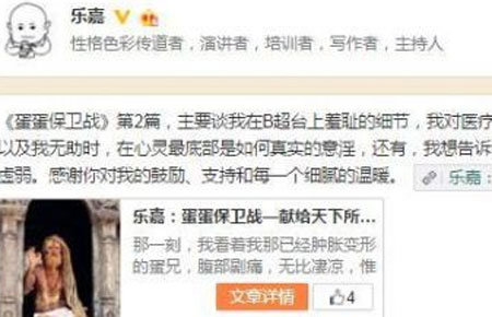 回顾整个事件,笔者观察到网络上送祝福的少,而嘲笑和落井下石的“大有人在”,不管乐嘉是不是被指责拿“蛋”炒作,但笔者相信,起码这次“蛋”真的是伤着了,而且伤的不轻。乐嘉在就医时就感叹,如今才懂得:“一只在,激战洒种可尽情随意;两只无,大圣一柱也休想擎天”的真谛。由此看来,乐嘉蛋碎遭调侃似乎在他的“预料之中”。