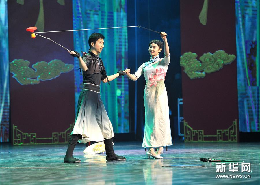 1月19日,在吴桥举办的首届中国杂技春晚上,演员表演杂技节目《舞动春天·空竹》。新华社发(苑立伟 摄)