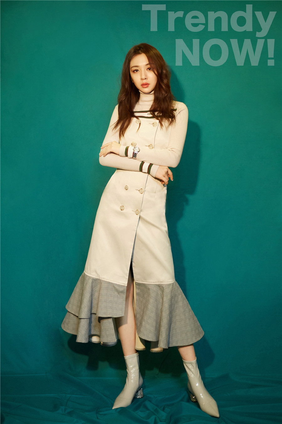 王晓晨身着米白色高领毛衣,外搭双排扣高叉鱼尾连衣裙,脚踩尖头长靴,一双撩人的大长腿若隐若现,严寒冬日也可以演绎别样性感。