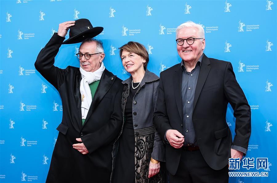 2月9日,在德国首都柏林,德国总统施泰因迈尔(右)和夫人比登本德(中),与柏林电影节主席迪特尔·科斯里克出席影片《布莱希特》首映前的拍照式。 当日,讲述德国剧作家和诗人贝托尔特·布莱希特生平的影片《布莱希特》作为第69届柏林国际电影节特别展映影片在德国柏林举行首映。 新华社记者 单宇琦 摄