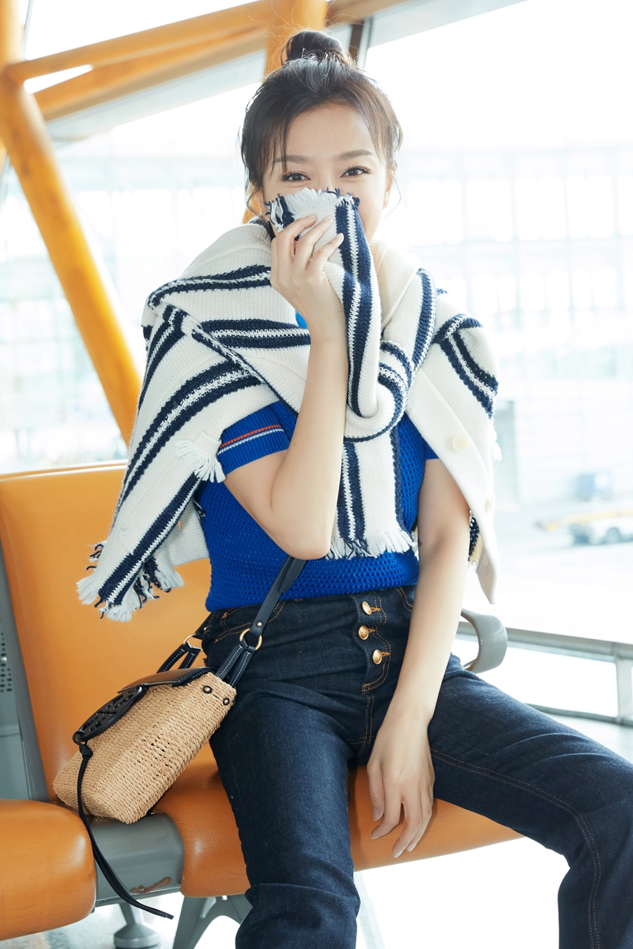 秦岚现身机场,受邀前往纽约时装周。条纹外套随性地系在肩上,高腰牛仔裤被挽起了裤脚,露出完整的高跟短靴,显得高挑帅气,休闲感十足。宝蓝色的网格polo毛衣,十分亮眼,搭配小巧精致的编织斜挎包,笑容灿烂,看起来心情很不错。