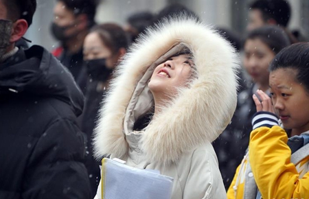 2月12日,一名排队准备入场的考生抬头观看飘落的雪花。 当日,中央戏剧学院2019年本科招生专业考试在东城校区拉开帷幕。 新华社记者 才扬 摄2月12日,一名考生查看考场位置。