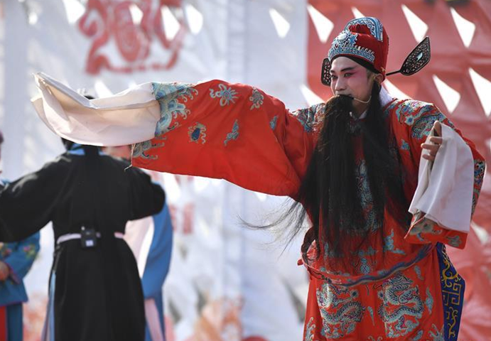 2月13日,伴奏演员为秦腔选段《铡美案》配乐。当日,宁夏银川市新春送戏下乡活动在永宁县人民公园举行,来自银川市文化艺术馆的演员为当地百姓献上一场精彩的传统曲艺表演。