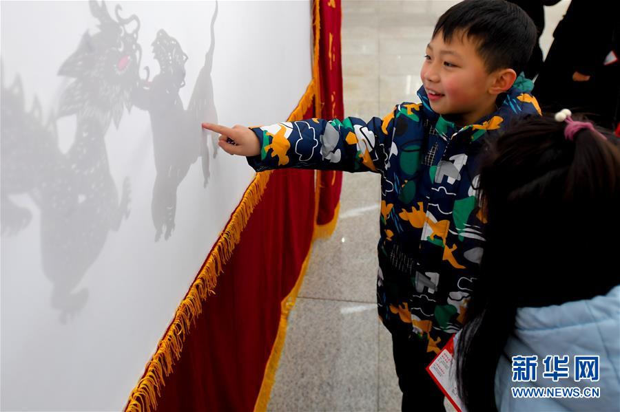 2月17日,小朋友在2019首届湖南非遗元宵喜乐会上观看皮影戏表演。