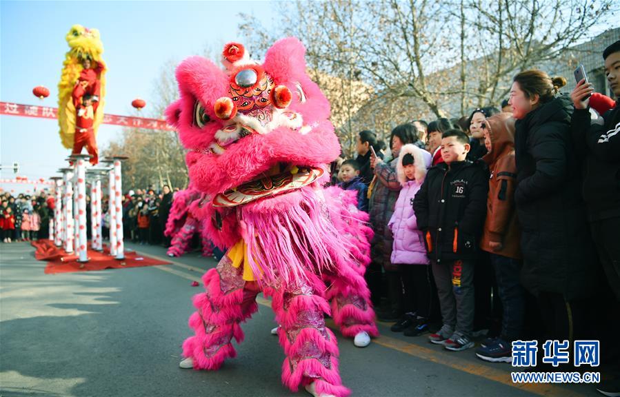 2月16日,在石家庄市深泽县举行的传统民间花会进城活动中,民间艺人在表演舞狮。