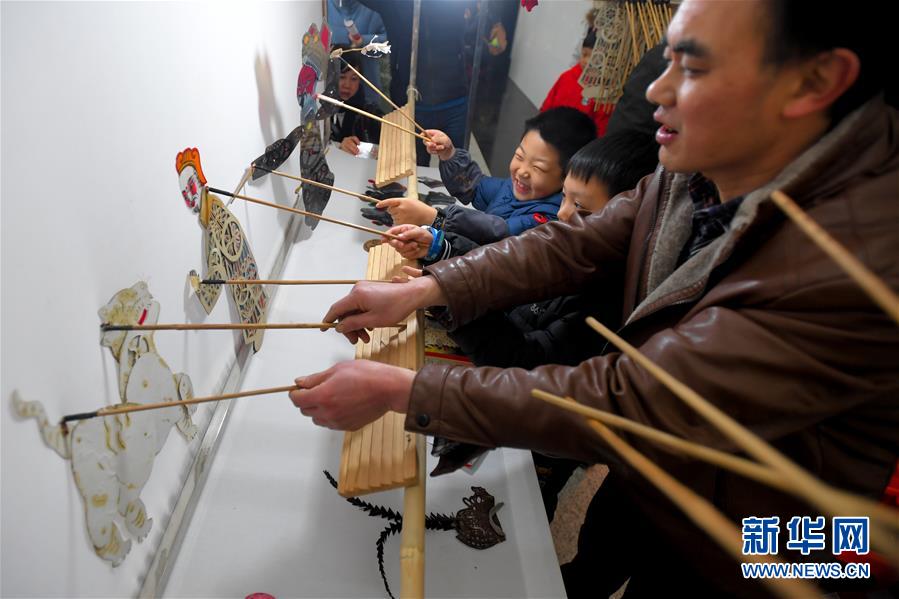 2月17日,游客在2019首届湖南非遗元宵喜乐会上体验皮影戏表演。