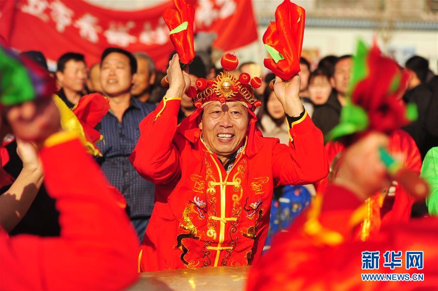 2月17日,花会表演队员在河北省任丘市大鼓花会艺术节上进行大鼓表演。