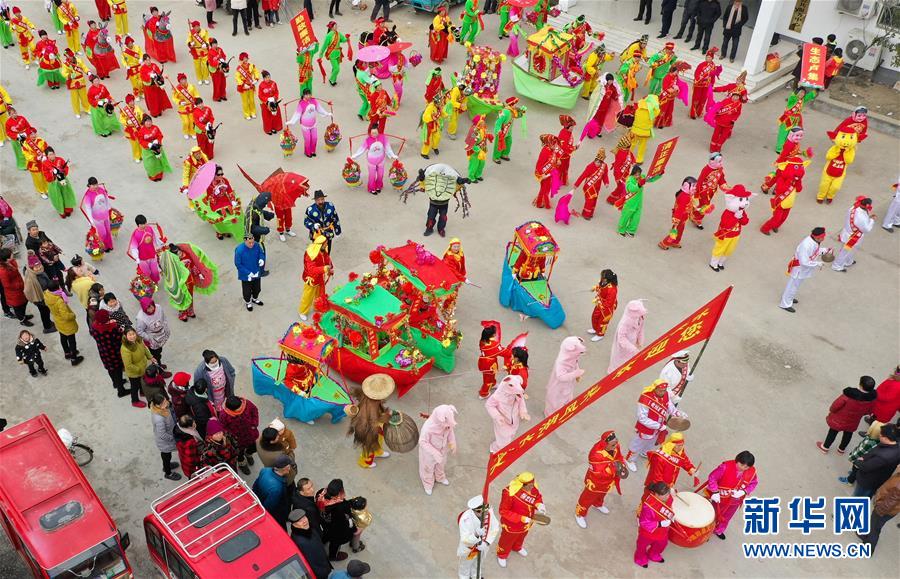 2月17日,演员在江苏省泗阳县卢集镇举行的民俗活动上表演节目(无人机拍摄)。
