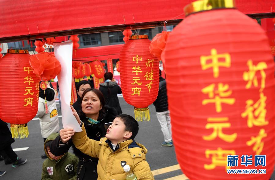 2月17日,小朋友和家长一起在安徽省合肥市包河区罍街举办的元宵灯谜节上猜灯谜。