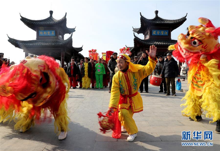 2月17日,民间艺人在安徽滁州市全椒县太平桥畔表演舞狮。