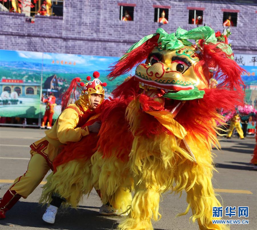 2月16日,山西省大同市举行非物质文化遗产展演,民间艺人在表演舞狮。